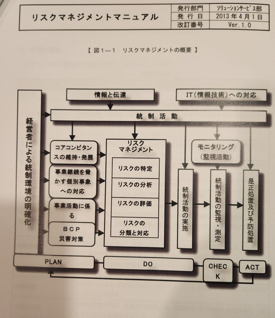 マニュアルの内容は、目的、適用範囲、内部統制、統制環境の整備及び運用、リスクマネジメント、統制活動の整備及び運用、情報と伝達、モニタリングに係る体制の整備及び運用、リスクマネジメントの評価及び報告、などから出来ています。