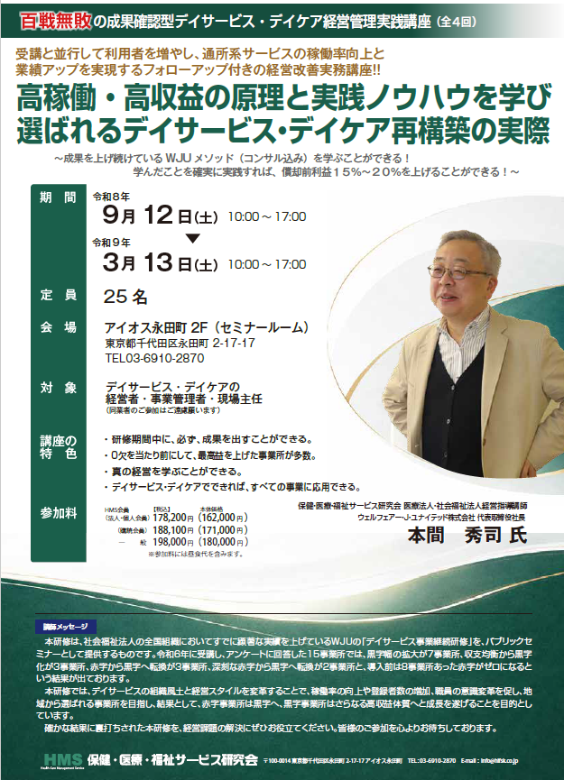 HMS百戦無敗の成果確認型デイサービス研修(全4回)において当社が講師を担当いたします。